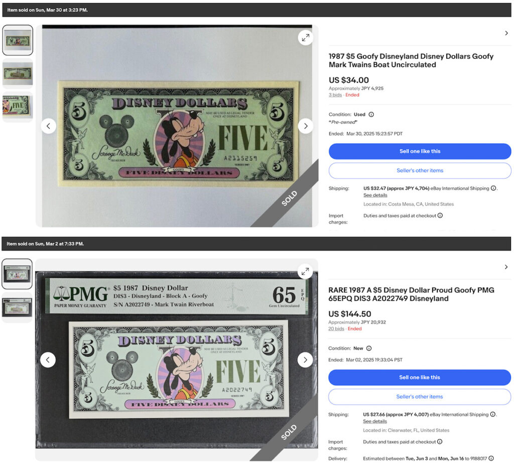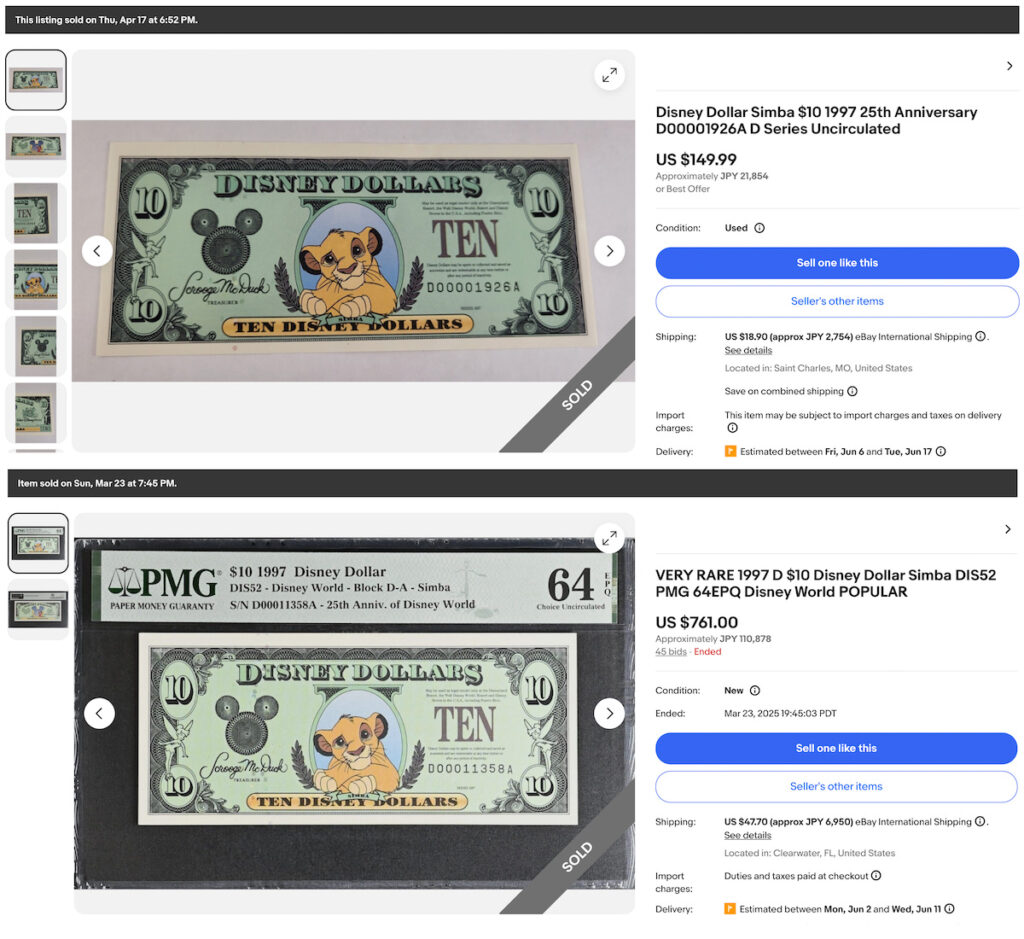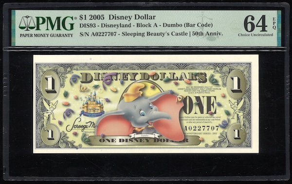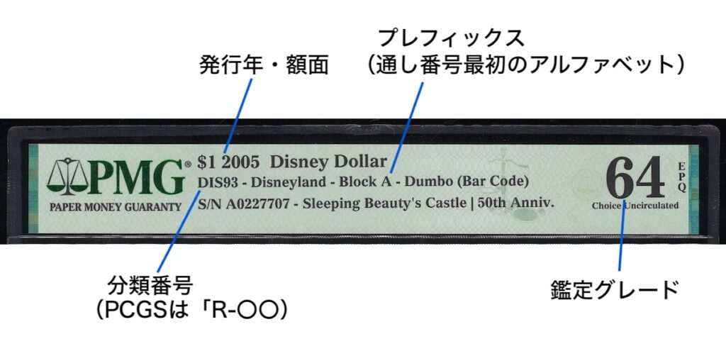 PMG、PCGSいずれもグレードを70段階に分けて評価するSheldon Grading Scale(シェルドン・グレーディング・スケール)の仕組みを採用。ディズニーダラーは比較的最近の紙幣なので、グレードが50未満の状態が悪い鑑定品はあまり見かけません。