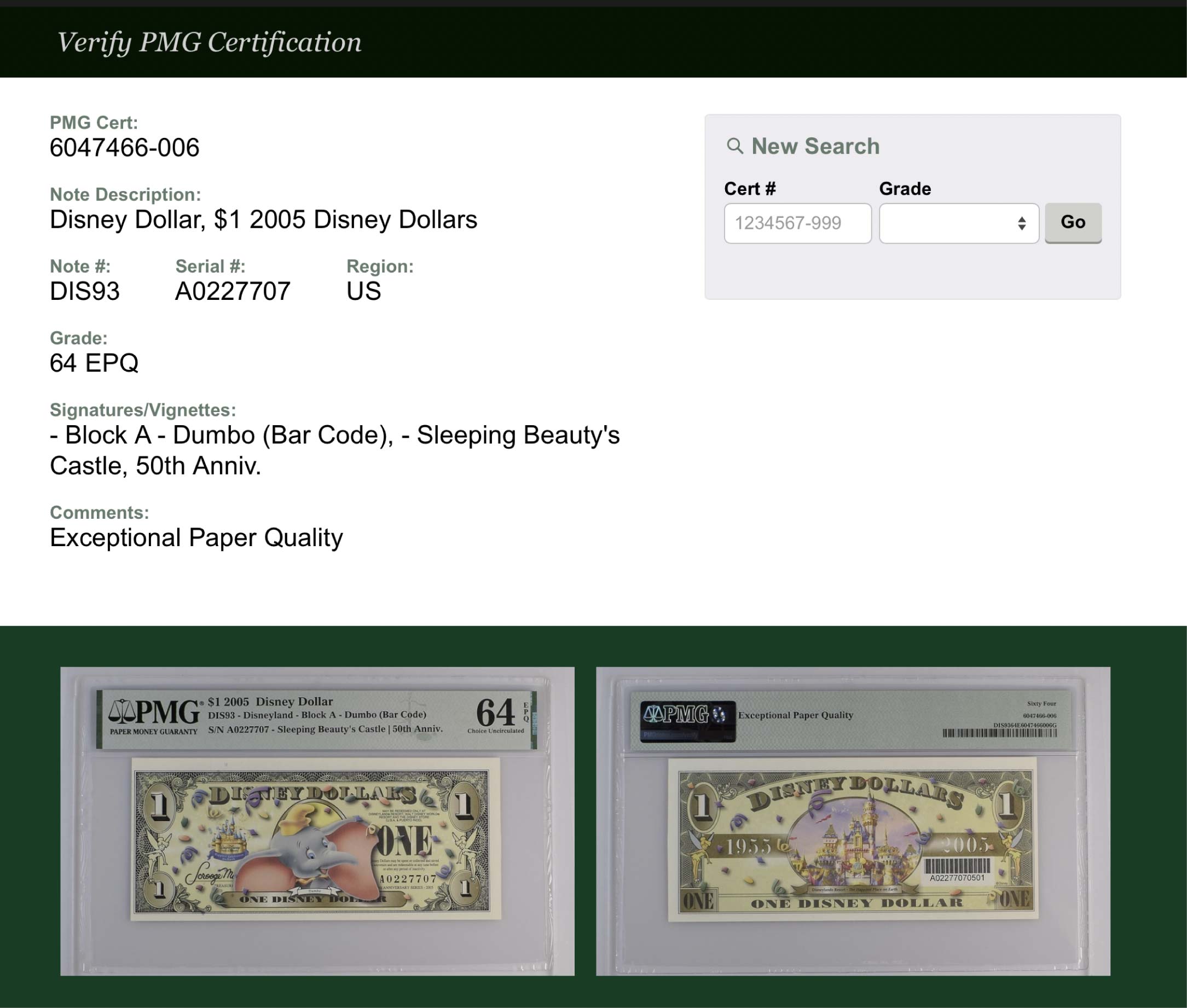 PMG、PCGSいずれもグレードを70段階に分けて評価するSheldon Grading Scale(シェルドン・グレーディング・スケール)の仕組みを採用。ディズニーダラーは比較的最近の紙幣なので、グレードが50未満の状態が悪い鑑定品はあまり見かけません。
