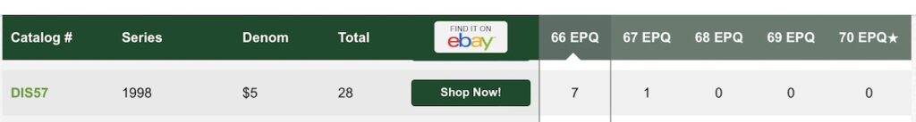 | 1998 D | $5 | DIS57 | 66 | $1,800 | 20214 |