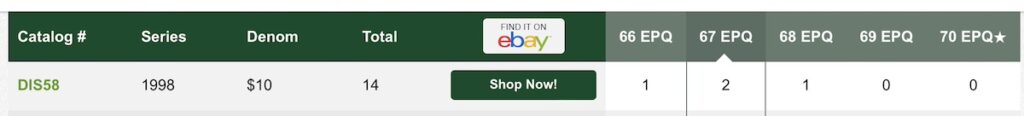 | 1998 D | $10 | DIS58 | 67 | $3,800 | 20215 |